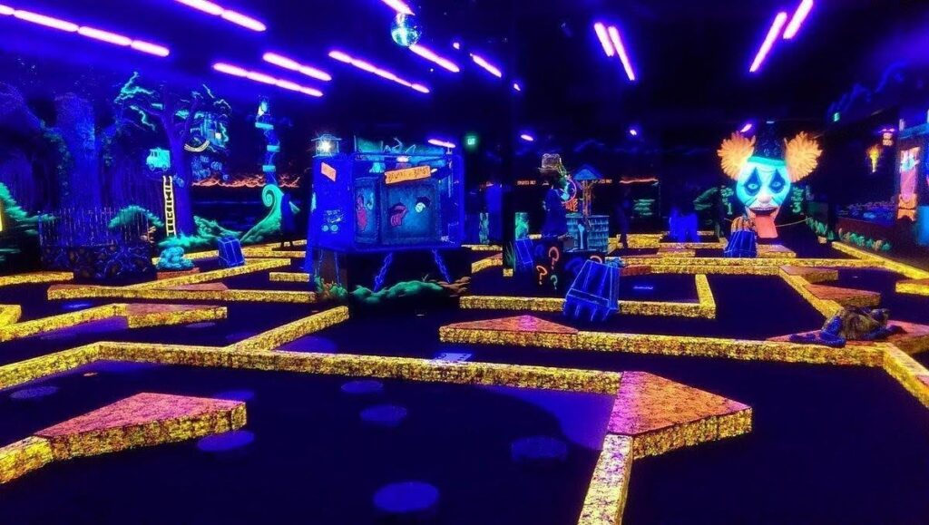 Glow-in-the-dark indoor mini golf with monster-themed animated holes