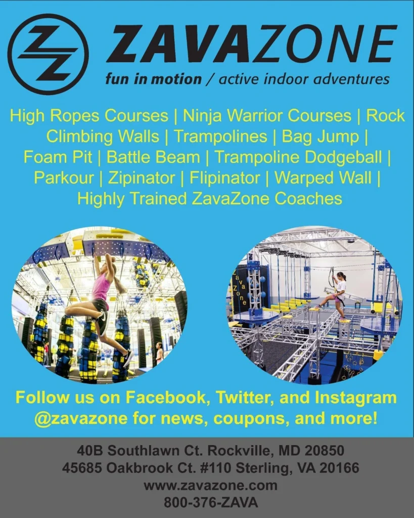 ZavaZone in Rockville is one of the DMV’s most loved trampoline and adventure parks, packed with open jump courts, foam pits, a ninja warrior obstacle course, extreme dodgeball arenas, SkyClimber rock walls, and the SkyRider zip line. Suitable for all ages with dedicated areas for toddlers and younger children, and easy highway access from the SoccerPlex via I-270. A high-energy destination perfect for tournament athletes and families alike.